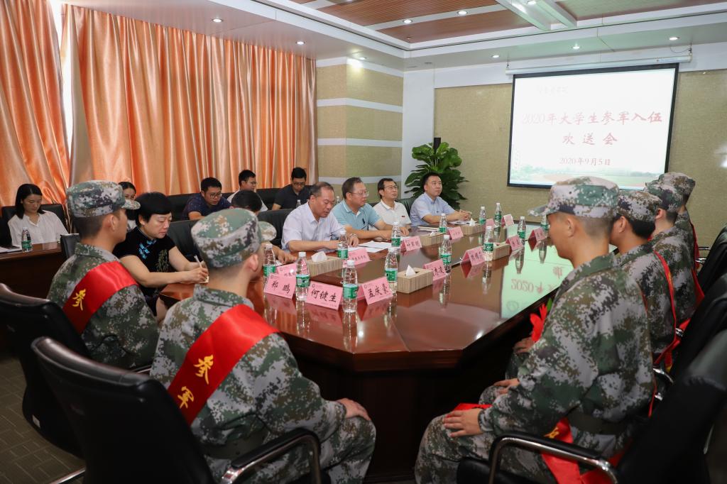2020年9月5日上午,赣南医学院2020年大学生参军入伍欢送会在黄金校区行政楼502会议室召开。学校党委委员、副校长叶军明出席会议,人民武装部、学生工作处(部)、团委、教务处、招生就业处、二级学院领导、辅导员、班主任代表和8名从章贡区应征入伍的应届毕业生参加会议。